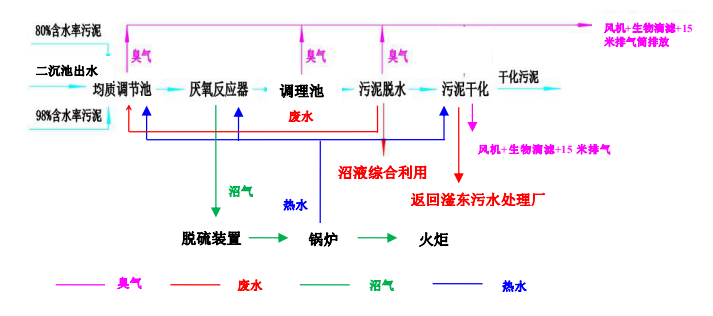 工艺流程:污泥调质+污泥厌氧消化+脱水+阳光棚污泥干化+外运协同焚烧处置。